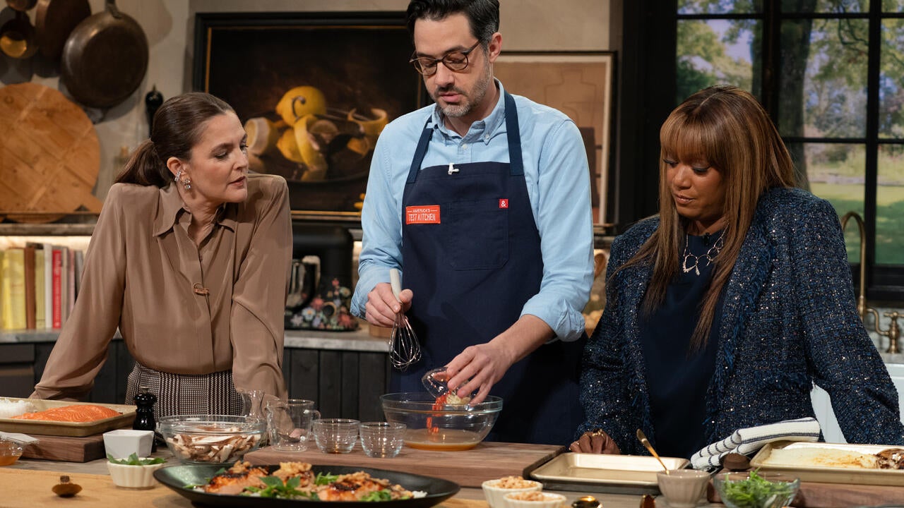 Dan Souza joins Drew Barrymore and Sunny Anderson in the kitchen to whip up a delicious recipe for Lime-Glazed Salmon and Crispy Rice Salad!