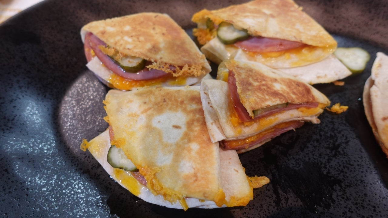 Place the tortilla on a round plate. Sprinkle the Cheddar on one half of the tortilla, and top with the ham. Microwave until the cheese is melted, about 1 minute. Top with the pickles and spread the mustard on the other half. Fold over to make a quesadilla shape.